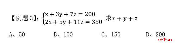 【解析】未知数的个数3个多于独立方程的个数两个,所以求解不定方程组,且求解的是x+y+z式子的结果,所以可以用特值法解不定方程组。因为答案唯一且确定,所以三个未知数具体值为多少都对最终答案x+y+z的和无影响,所以可令其中某个未知数为0;令y为0则