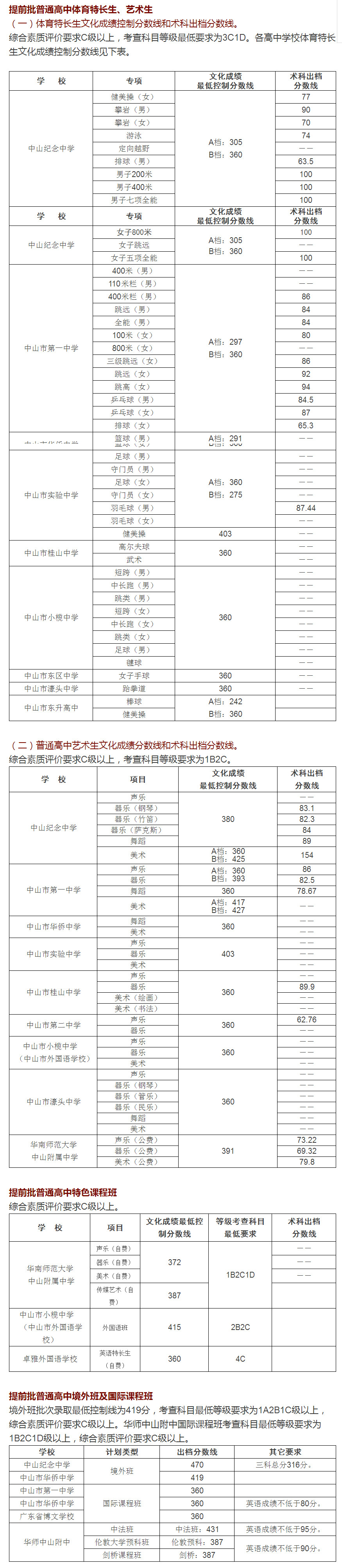 根据《关于印发中山市2018年高中阶段学校考试招生工作意见的通知》(中教体〔2018〕15号)和《中山市教育和体育局关于进一步规范普通高中学校招收体育艺术特长生工作的通知》(中教体通〔2018〕47号)文件精神,经中山市高中阶段学校招生工作领导小组研究决定,现将2018年各批次录取最低控制分数线公布如下:
