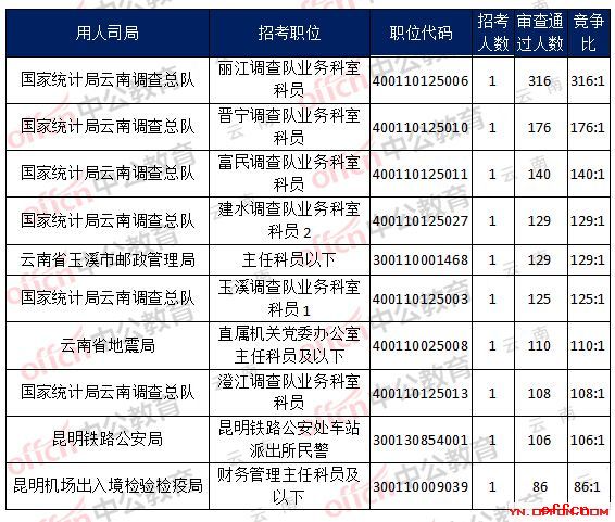 当前最受欢迎的岗位是国家统计局云南调查总队,丽江调查队业务科室科员,职位代码:400110125006,招录1人,316人报名,其中52人待审核通过,详情如下图: