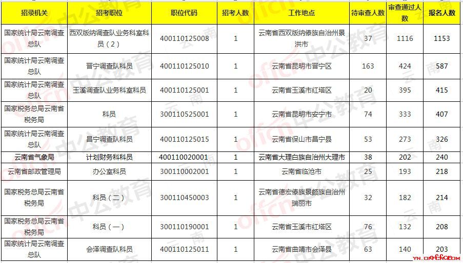 职位分析:截至2018年10月31日9时报名第10天,国家公务员考试云南考区报名人数最多的岗位是西双版纳调查队业务科室科员(2)职位代码:400110125008,该岗位招录人数1人,报名人数3697人,待审查人数为358人,审查通过人数为3339人;该职位学历仅限本科,专业要求为:理工、工学;工作地点:西双版纳傣族自治州景洪市,从报考条件来看该职位虽然要求宽泛,在这里提醒未报考的考生,一定要理性报考适合自己的职位。