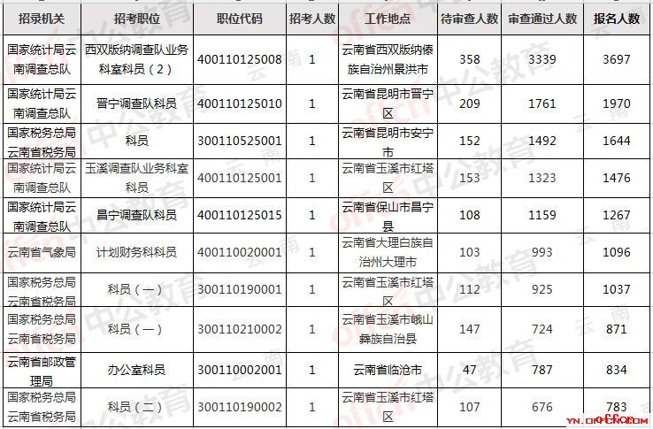 职位分析:2019国考报名第10天,云南考区报名最热门的职位依然为西双版纳调查队业务科室科员(2)职位代码:400110125008;该岗位比例已到达了3697:1;专家建议广大考生多关注一些较冷职位,避免激烈竞争...