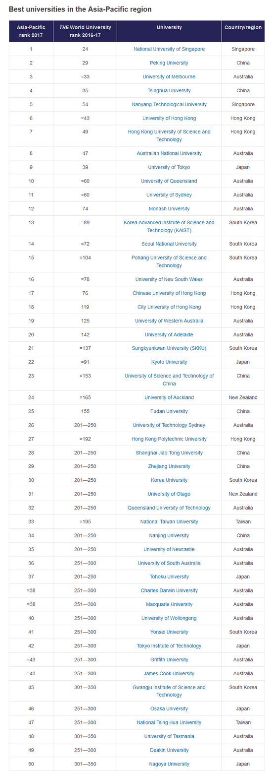 以下为《泰晤士报高等教育》亚太地区大学排行榜TOP50