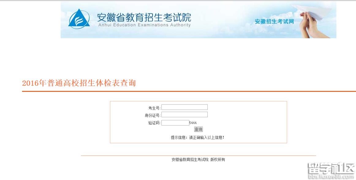 2016安徽普通高校招生体检表查询系统:http://cx.ahzsks.cn/pugao/pgtjb2016_in.php