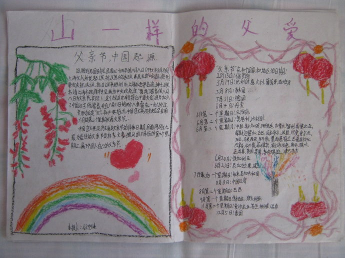 在父亲节到来的时候,我们应该做好准备,在这个盛大的节日里,绘出手抄报献给自己的父亲,希望父亲在看完以后会感到欣慰。以下是由出国留学网小编为大家整理的“初中生父亲节手抄报图片”,仅供参考,欢迎大家欣赏。