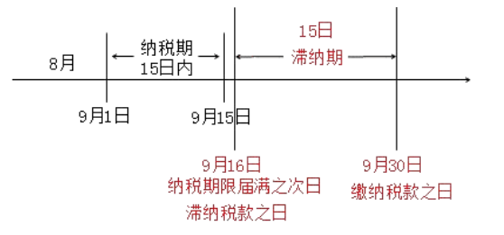 【答案解析】根据规定,增值税纳税人以1个月或者1个季度为一个纳税期的,自期满之日起15日内申报纳税,本题中,该公司以1个月为纳税期限,因此8月应缴纳的增值税和城建税应该在9月15日之前申报纳税,该单位在9月30日办理纳税申报,滞纳天数为15天。则该公司应缴纳的滞纳金=(60000+4200)×0.5‰×15=481.5(元)。