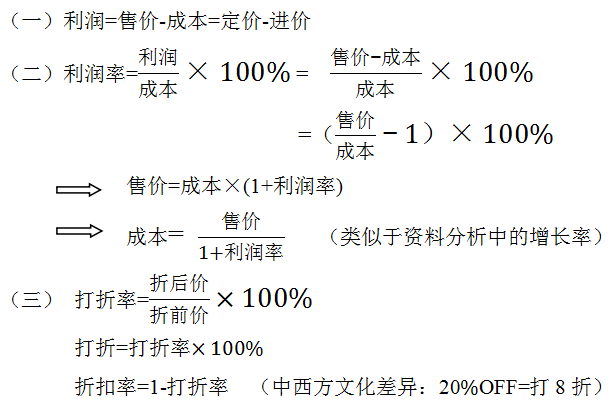 对于利润问题,研究的也是售价、成本、利润、利润率以及打折的问题。对于这些概念我们更好的可以通过公式来了解。