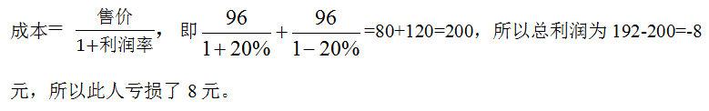 【解析】题干问法“盈亏情况如何”实际是问在整个交易中此人利润为多少,可根据公式利润=售价-成本,其中总售价为96×2=192,成本为可利用公式
