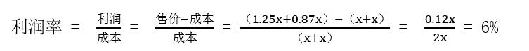 【中公解析】题目中所求为利润率,但是并没有已知利润和成本。根据题目得知,两件衣服成本价相同,因此可以假设成本价都100.两件商品成本共计200.第一件商品售价为125元,第二件商品售价为87元。则两件商品售价为212元,成本为200元。则利润为12元。利润率=利润÷成本=12÷200=6%。