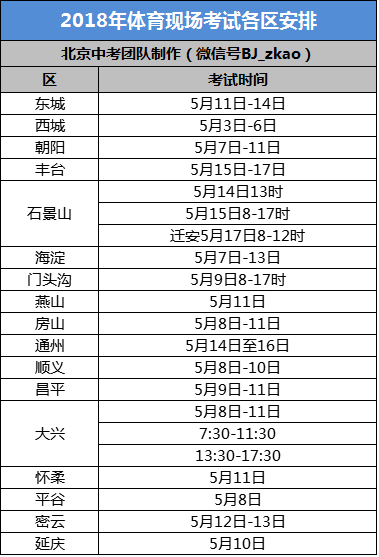 2018年中考体育现场考试安排在5月份进行,具体时间由各区确定,目前西城区已确定该区正式考试时间为5月3日至6日。