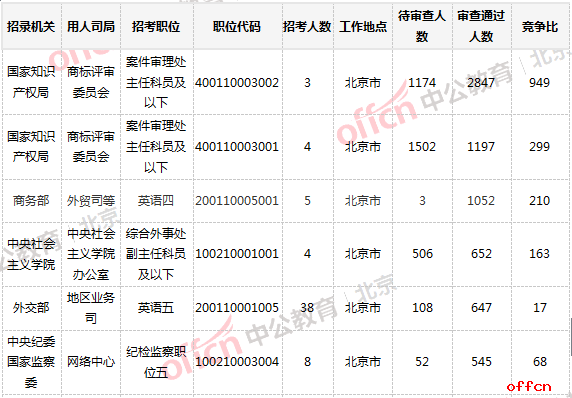 截止到31日9:00时,通过审核人数前三位的部门依次是:国家知识产权局、国家税务总局北京市税务局、外交部,三部门通过审核总人数达55661人,占通过审核总人数的34.66%,目前已报名考生还有许多未通过系统自动审核。为帮助广大考生更清晰的了解今日报名情况,整理了已有考生通过资格审核部门,统计审核通过人数前十位的部门。竞争比最大的部门是国家中医药管理局,竞争比为935:1,以下信息供广大考生参考:
