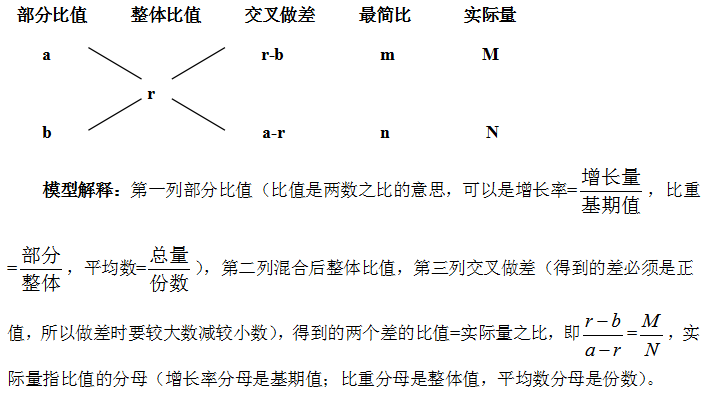 在行测数量关系中的十字交叉模型已被大家所熟知,十字交叉模型解决的是比值的混合问题,在数量关系中主要解决溶液的混合问题。而十字交叉模型在资料分析中也发挥着至关重要的作用,主要应用于增长率﹑比重﹑平均数等的混合问题。小编在此进行分析。