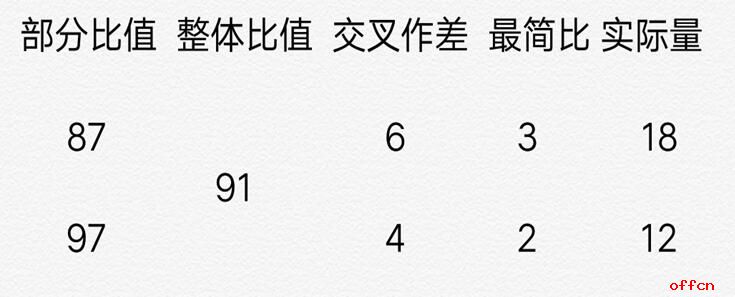 第三步是交叉作差,把部分比值和整体比值的差写到交叉的位置,也就是87与91的差4写到下面,97和91的差6写到上面,得到(6和4)