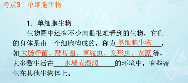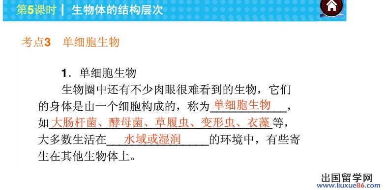同学们复习《单细胞生物》时要注意三点:1、描述单细胞生物的形态结构特点。(重点)2、描述单细胞生物的生命活动特点。(重点)3、举例说出单细胞生物对外界刺激能产生反应。(难点)更多有关2014中考生物的信息可登录出国留学网生物频道,欢迎收藏本站(CTRL+D即可收藏)!