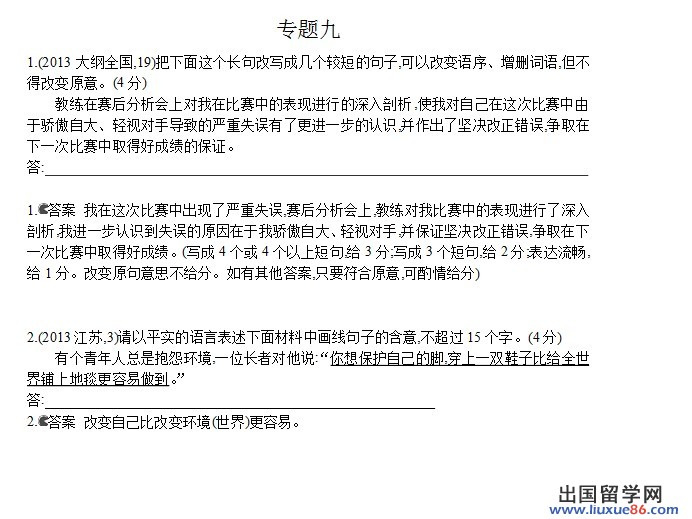 出国留学网高考频道在考试后及时公布各科高考试题答案和高考作文及试卷专家点评。请广大考生家长关注,祝福广大考生在2013年高考中发挥出最佳水平,考出好成绩!同时祝愿决战2014高考的新高三学员能倍加努力,在2014年高考中也能取得优异的成绩。