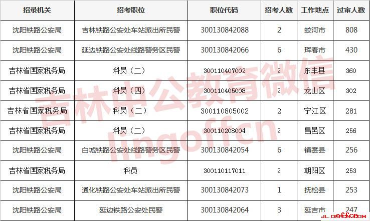 报名通过审核人数前十的职位主要集中在沈阳铁路公安局、吉林国家税务局等部门,具体信息如下: