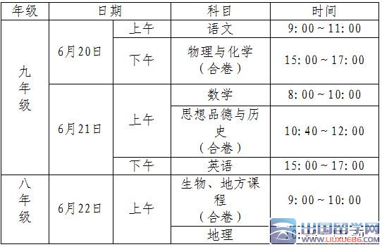 2016年中考考试时间为在6月20日至21日。各科具体考试时间(北京时间)如下: