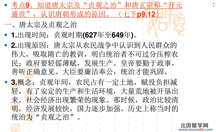 同学们复习《唐太宗及贞观之治》时要注意重难点:重点:唐太宗和贞观之治.难点:唐朝出现“贞观之治”的原因;如何评价历史人物。更多有关2014中考历史的信息可登录出国留学网历史频道,欢迎收藏本站(CTRL+D即可收藏)!