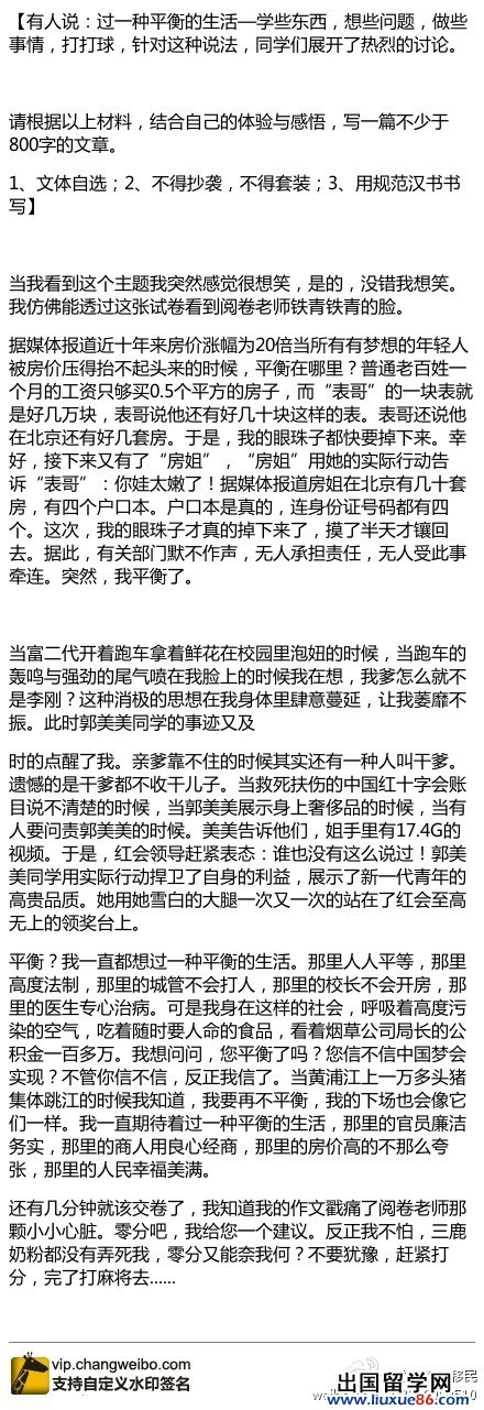 平衡?我一直都想过一种平衡的生活。那里人人平等,那里高度法制,那里的城管不会打人,那里的校长不会开房,那里的医生专心治病。可是我身在这样的社会,呼吸着高度污染的空气,吃着随时要人命的食品,看着烟草公司局长的公积金一百多万。我想问问,您平衡了吗?您信不信中国梦会实现?不管你信不信,反正我信了。当黄浦江上一万多头猪集体跳江的时候我知道,我要再不平衡,我的下场也会像它们一样。我一直期待着过一种平衡的生活,那里的官员廉洁务实,那里的商人用良心经商,那里的房价高的不那么夸张,那里的人民幸福美满。