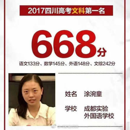 文科第一名是来自成都市实验外国语学校涂涴童:文科668分(语文133分、数学145分、外语148分、文综242分)。