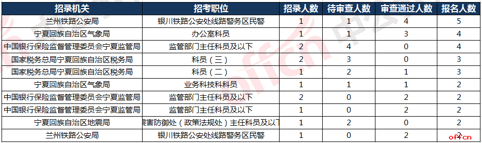 为帮助广大考生更清晰的了解今日报名情况,整理了报名人数前十位的职位,供广大考生参考: