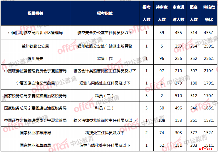 截至10月30日16时,据统计,国考职位中工作地点在宁夏的职位通过审核总人数为8146人,报名总人数为9676人,竞争比最高的岗位是中国民用航空局西北地区管理局,竞争比高达455:1。