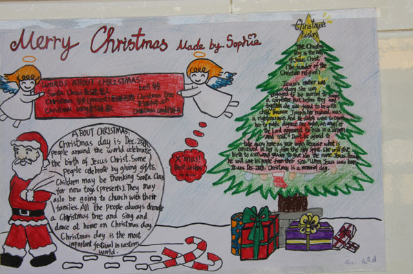 12月19日~24日,班主任布置学生带彩带、圣诞树、圣诞帽、音乐(铃儿响叮当等)、喷雪、零食、装饰品、小礼品、圣诞义卖物品等活动所需物品。