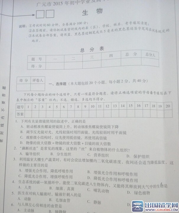 记住:你是你生命的船长,走自己的路,何必在乎其它。出国留学网中考频道的小编会及时为广大考生提供:2015年四川广元市中考生物试题及答案,有需要的考生可以在考题公布后刷新本页面(按ctrl+F5),希望对大家有所帮助。