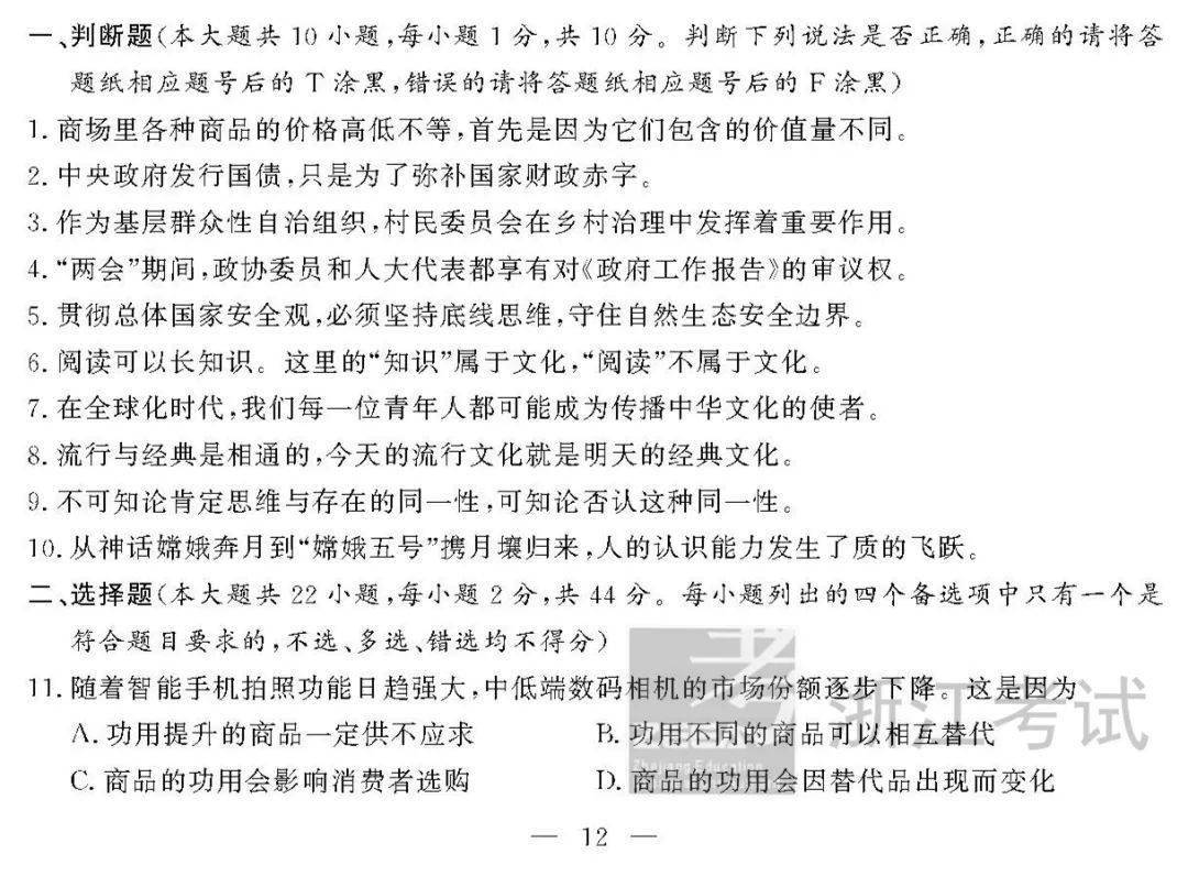 试卷严格按照课程标准的要求命制,题型稳定,题量适度,难易适中,试题从易到难梯度安排合理。试题考查内容覆盖经济常识、哲学常识和政治常识三个部分,分值占比分别为40%、30%、30%。
