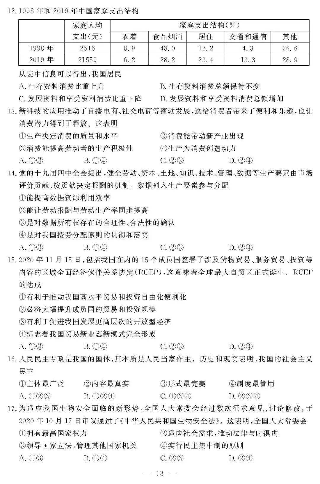 试卷关注学科核心素养,考查考生在真实情境中分析问题和解决问题的能力。比如,试题结合我国居民日常活动平均时间变化的统计图表,考查考生读取整合信息并加以分析说明的能力。又如,试题创设了高三学生制订生涯规划这一和每个考生相关度很高的情境,要求考生综合运用相关学科内容进行“分析评价”和“行为选择”。