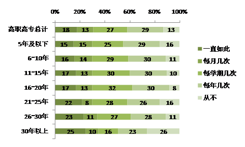 在本科院校任职的教师中,从教30年以上的群体一直处在职业倦怠状况的比例(24%)比从教5年及以下的群体(11%)高13个百分点。在高职高专院校任职的教师中,从教30年以上的群体一直处在职业倦怠状况的比例(25%)比从教5年及以下的群体(15%)高10个百分点。