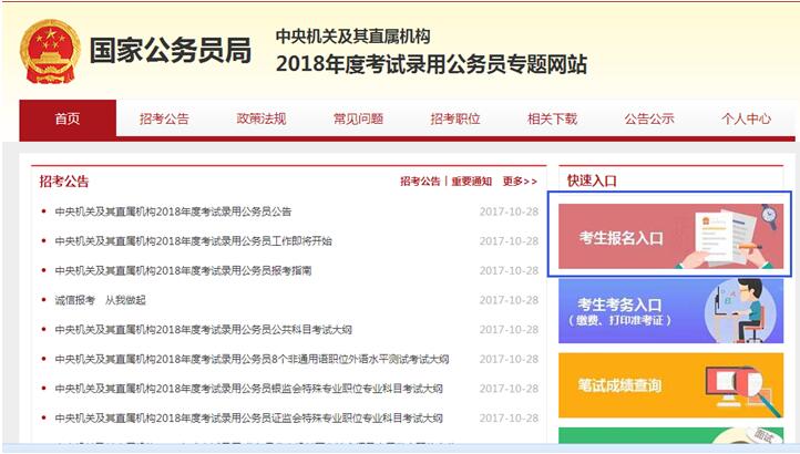 首先打开中央机关及其直属机构2018考试录用公务员专题信息网页http://bm.scs.gov.cn/pp/gkweb/nps/apply/ui/business/home/gkhome.html?examkey=20180011