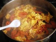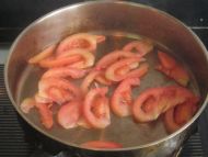 9.锅里油热,放下西红柿煸炒至发蔫.