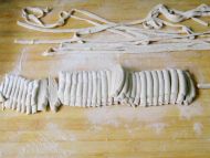 发酵时间到了,我们用手把面团分成几块,压扁,用擀面杖擀,擀成薄薄的一片,接着将这一片薄薄的面皮对折再对折,用刀切成“丝”。将“丝”打开,就是一根长长的面条了!