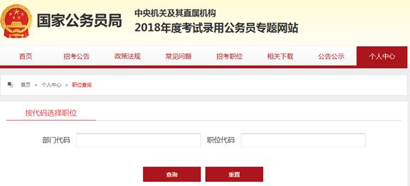 在选职位时首先需要输入两个代码:部门代码和职位代码,考生要打开职位表,选出自己能报考的职位,把两个代码填写完之后 点击“查询”,即可看到选报职位的详细信息,如果输入错误需要重新输入,那样的话点击“重置”,就可以重新选择。