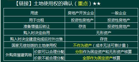 4、土地使用权,一般单独确认为无形资产;用于出租或增值时,应将其转为投资性房地产。自行建造厂房等建筑物时仍然单独确认,并与建筑物分别计提折旧和摊销;但房地产开发企业应将土地使用权计入开发成本。