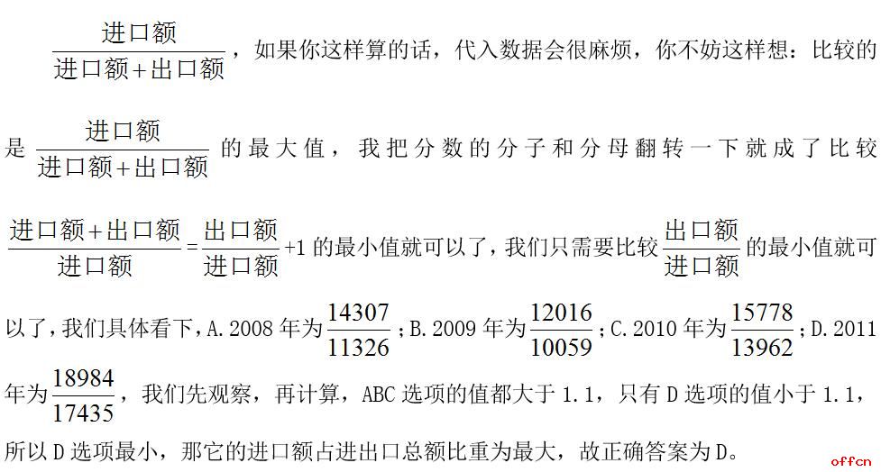 【答案】D。解析:问题问的是中国内地货物进口额占当年货物进出口总额比重最大的是,那我们就是把四个选项中每一年的比重来比较大小。那我们来看,题目中告诉我们什么,表格中分别告诉我们的是每一年的出口额和进口额,那求进口额占进出口总额的比重为: