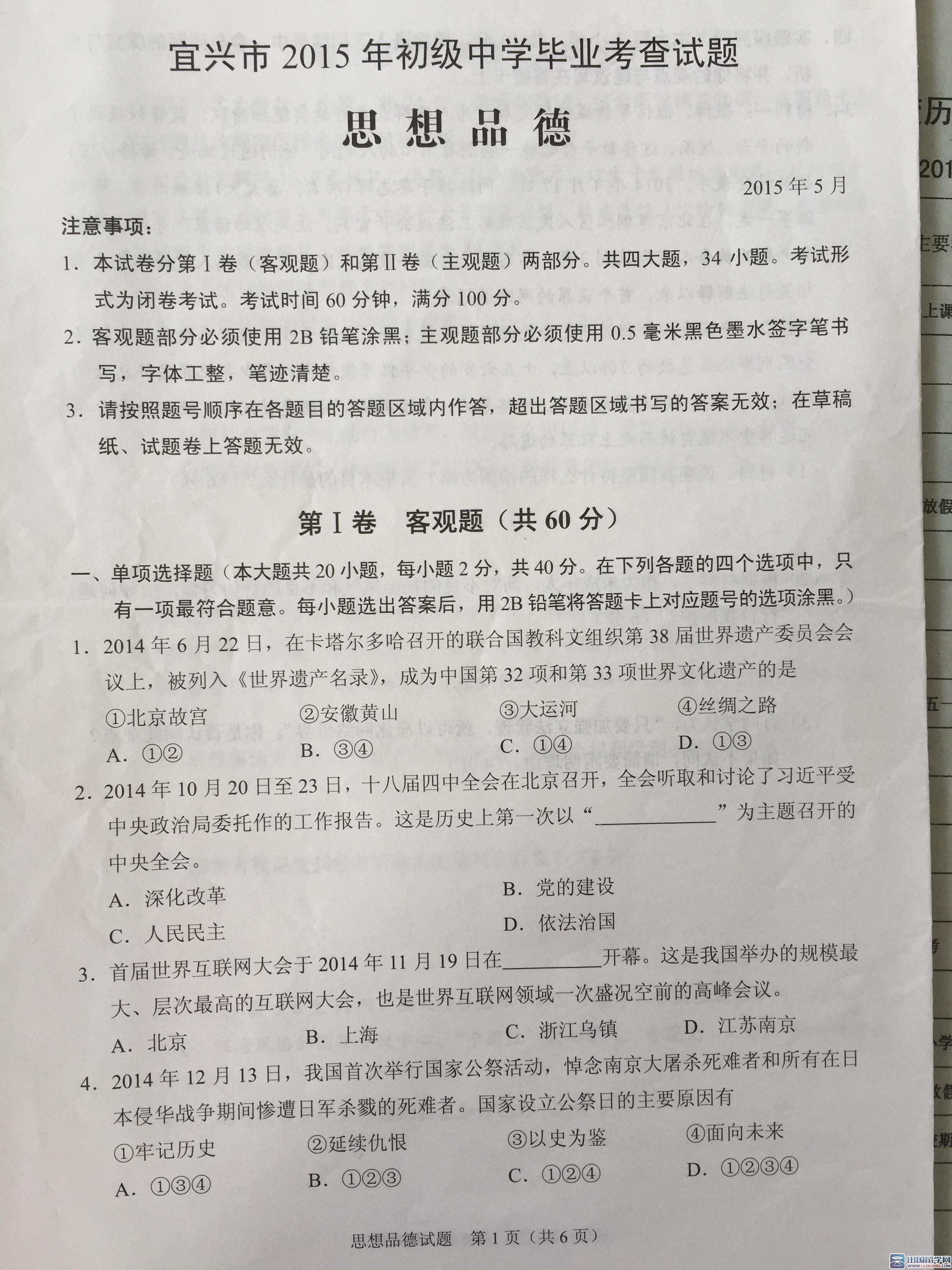点击下载>>2015年江苏宜兴中考政治试题及答案