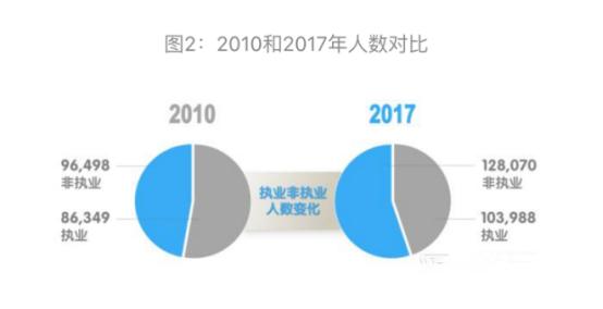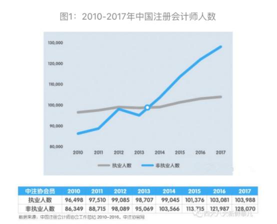 这是2010年中国注册会计师协会执业人数和非执业人数的数据对比,可以看出两者的差距在进一步拉大。从下图可以很直观的看出,八年时间人数的变化。