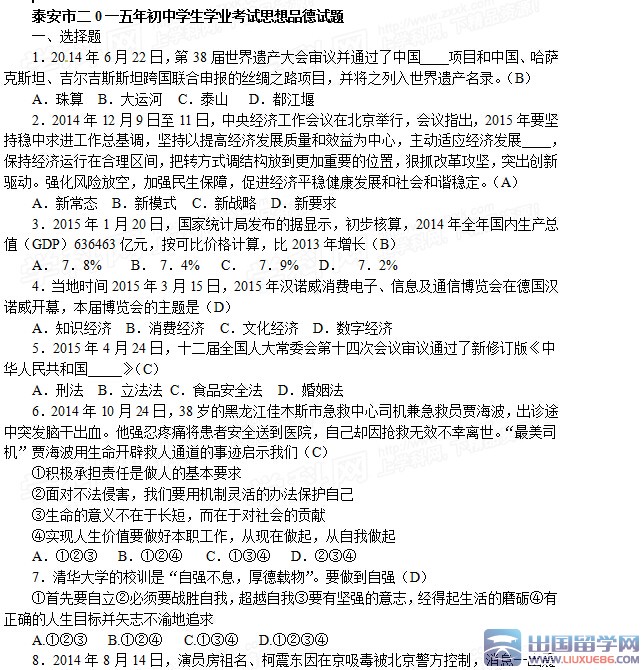 不论成功还是失败,都是系于自己。出国留学网中考频道的小编会及时为广大考生提供:2015年山东泰安市中考政治试题及答案,有需要的考生可以在考题公布后刷新本页面(按ctrl+F5),希望对大家有所帮助。