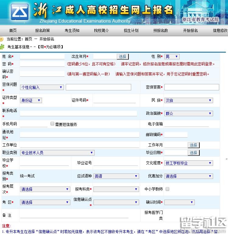 首先,在2017年浙江成人高考报名时间内进入2017年浙江成人高考网上报名系统页面,阅读2017年浙江成人高考报名政策、考试须知。