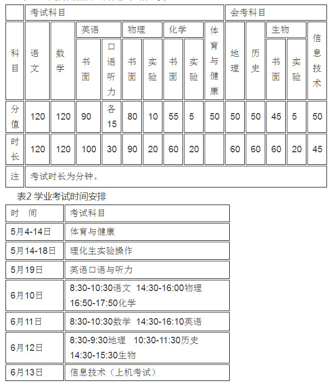 2018年初中学业水平考试考试考试科目为语文、数学、英语(含口语听力)、物理(含实验操作)、化学(含实验操作)、体育与健康6个学科;会考科目为地理、历史、生物(含实验操作)、信息技术4个学科;考查科目为地方课程、学校课程、音乐、美术、综合实践活动。
