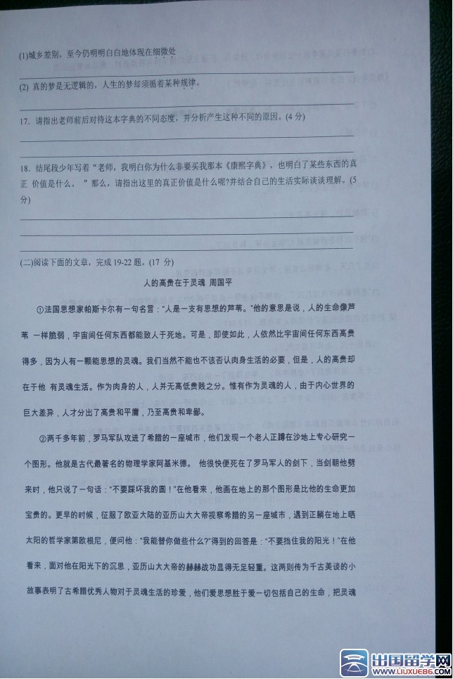 脚踏实地地学习,经历汗水洗礼,才更懂得收获的喜悦,加油!出国留学网湖北中考语文试题及答案频道的小编会及时为广大考生提供2017年湖北中考语文试卷及答案,有需要的考生可以在考题公布后刷新本页面(按ctrl加F5),希望对大家有所帮助。