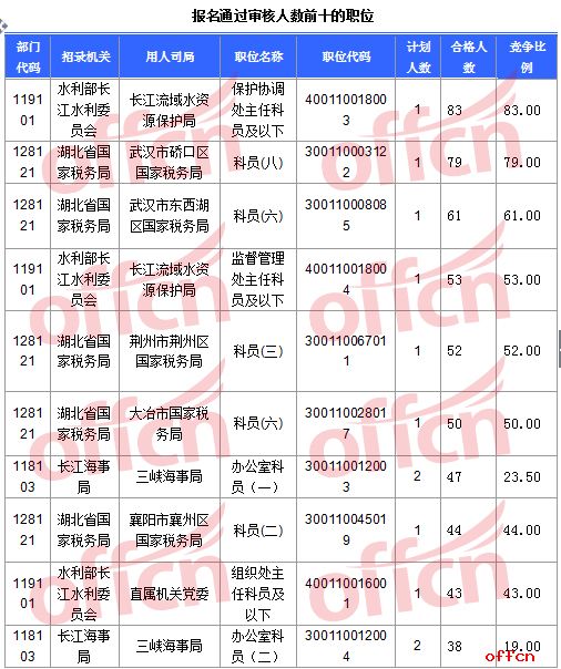 报名通过审核人数前十的职位主要集中在水利部长江水利委员会、湖北省国家税务局、长江海事局等部门,具体信息如下: