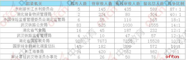 截止到11月3日16时,报名人数排名前三位的部门依次是:湖北省国家税务局、武汉铁路公安局、长江海事局,三部门通过审核总人数达14005人,占通过审核总人数的86%。