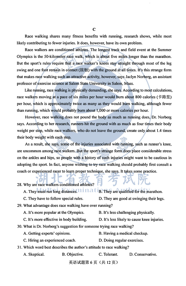 2020年湖南高考英语试卷及参考答案