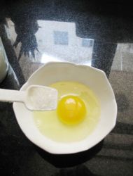 2.鸡蛋磕在碗里,加入砂糖,打至糖溶蛋散。