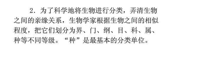 分类单位越大,包含物种越多,但物种间的相似程度越小,共同特征越少,亲缘关系越远;分类单位越小,包含物种越少,而共同特征越多亲缘关系越近;