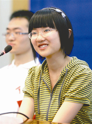 还未见到理科状元胡梦萦,人大附中的老师们就已有了评价:“这可是我们高三年级最漂亮的姑娘。”昨天(6月23日,下同)下午4点,当娇小、秀气的胡梦萦出现在人大附中时,立即被等候多时的摄影记者包围。面对不断闪烁的闪光灯,胡梦萦露出了羞涩的笑容,足足有一分钟,像个孩子似的站在那里不知所措。
