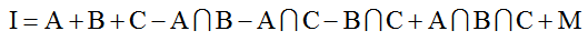 相对两者容斥而言复杂一点,利用三种属性将总数进行分类的计数问题,可分别用A,B,C表示属性,I表示总数,M表示三个属性都未包含的部分,则可以得到