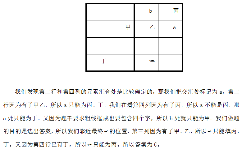我们会发现图中要求行每列以及粗线框成的4个小正方形中均含有甲、乙、丙、丁4个汉字,我们需要找好突破口才更容易解题。